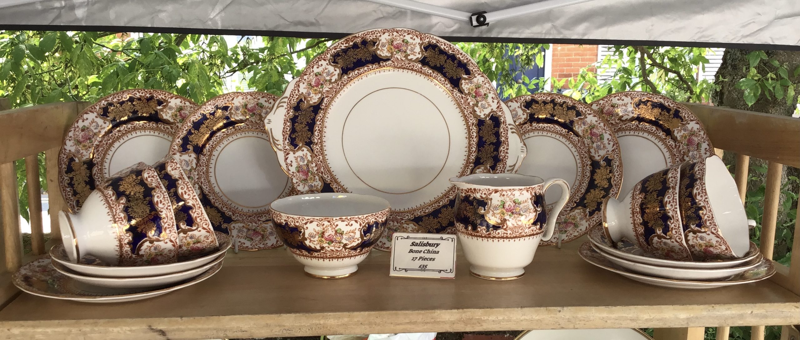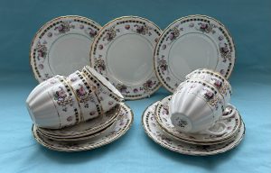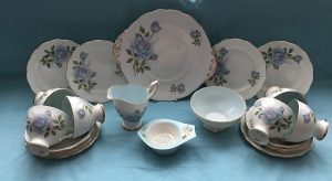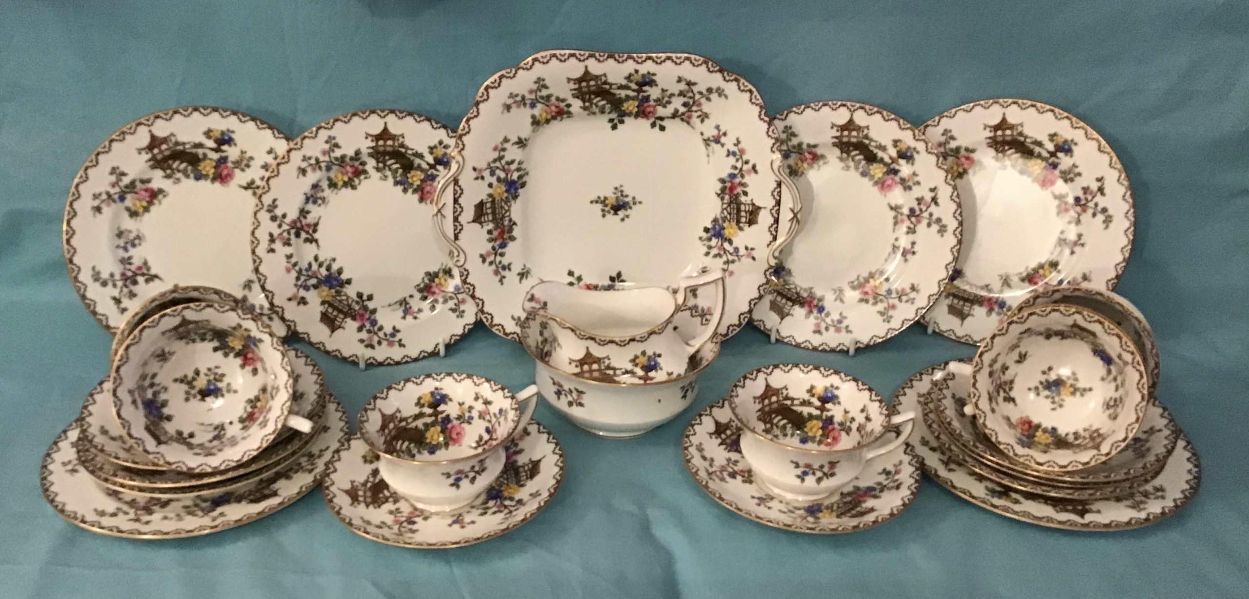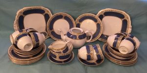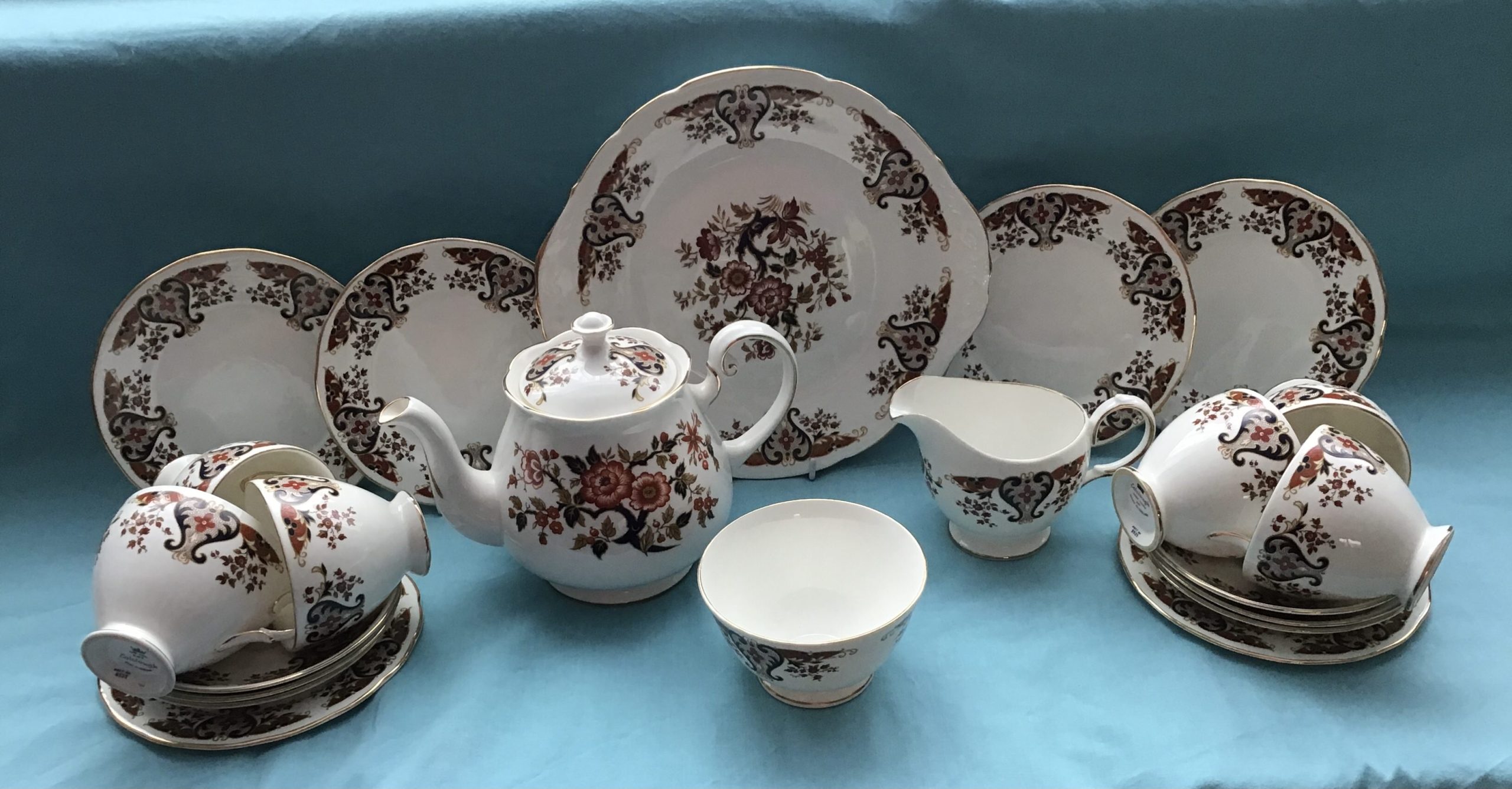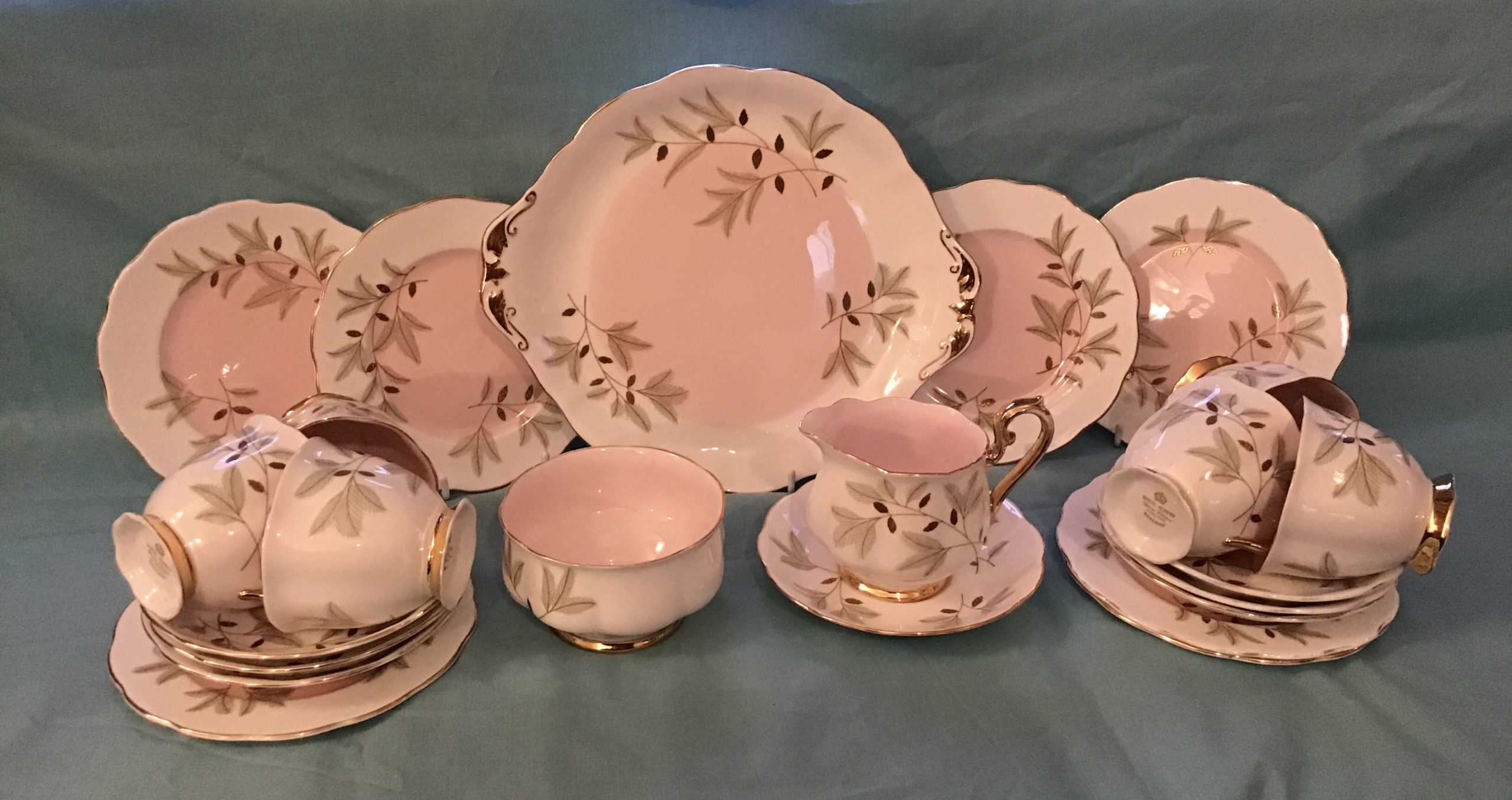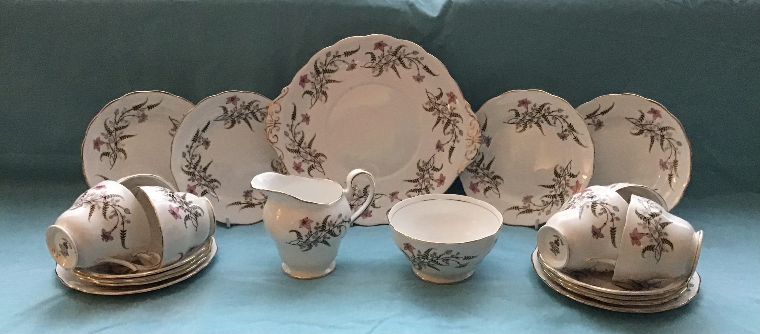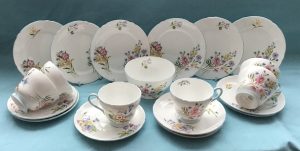 Paragon Country LaneRoyal Albert Val D’orParagon BelindaColclough Royale (Full Set, cake stand available)Colclough Royale Cake StandRoyal Standard, Fancy FreeParagon RockeryRoyal Standard, FascinationRoyal Albert, BraemarSalisbury China Imari StyleParagon, BelindaTuscan, Bluebird (extra 3 cups)Aynsley, Pagoda Set with two extra Cup & SaucerShelley, Harebell (cup missing)Gossamer, Harlequin 6 Trio’sFrench Porcelain White and GoldRoyal Doulton CamelotTuscan China Green and WhiteA selection of Vintage China c1880Jackson & Gosling Old EnglishDenby SandstoneShelley, Wildflowers19c Staffordshire Chinese ChinaRoyal Doulton WindermereColclough Ivy LeafCanonsbury Wild CloverAynsley, Bluebell Three Trio’sRoyal Cauldron Trio’sAdderley, Manor Roses Set of FourWild Bros Evelyn 5 Trio’sParagon, Queen Anne 8 Soup Bowls & SaucersBlue Cornflower Sandwich SetStaffordshire, Imari Style Sandwich SetWoods Bulslem Forrest Flowers by Susie CooperMelba Ware, Floral Set 6 Trio’sRoyal Grafton Yellow Rose Two Trio’sDenby MemoriesQueen Anne Old County SprayRoyal Winton, Petunia Part Tea SetAlboth & Kaiser Alka KunstRoyal Crown Derby, Bali 6 Tea PlatesLimoges Set of 4 PlatesPair of Limoges PlatesParagon, Iceland Poppy Pair of Cake PlatesWedgwood Cake PlatesMyott, Coronation Rose Pair of Cake PlatesRoyal Doulton, Art Deco Fruit SetRoyal Grafton Majestic Cake StandLeighton Pottery Burslem Cake StandMinton & Holins Japanese ImariAynsley, Green & Gold Cake Plate1989 Christmas PlateAynsley, Bluebell Cake PlateArt Deco Pressed Glass PlateVictorian Large Meat PlaterF Winkle & Co Partridge Tea PotYugoslavian China made for AvonRoyal Doulton Tea Pot (a/f)Tom Tit Teapot StandWinterling, Bavaria TrioSutherland, Art Deco TrioCarlton China, Springtime Swallows, TrioAynsley, Bluebell TrioParagon, Primrose TrioParagon, Woodland Bluebell TrioWedgwood, Colchester Cup and SaucerHadfords, Blue Poppy Cup and SaucerCrown Staffordshire, Forsythia Cup and SaucerBurleigh Ware, Zenith Cup & SaucerColclough, Lyndon Cup & SaucerHeathcote China The PathwaysRoyal Albert GossamerRoyal Albert Flower of the MonthRoyal Cauldron Milk & Sugar BowlDuchess China Sugar Bowl & Milk JugAynsley, Bluebell Sugar BowlPrice Kensington Mr Celery PotCarlton Ware, Scotch Whisky Water JugCut Glass and Plated Silver Tantalus