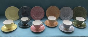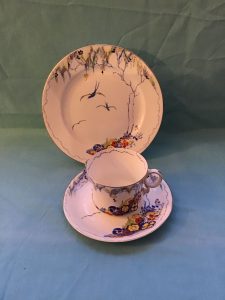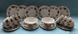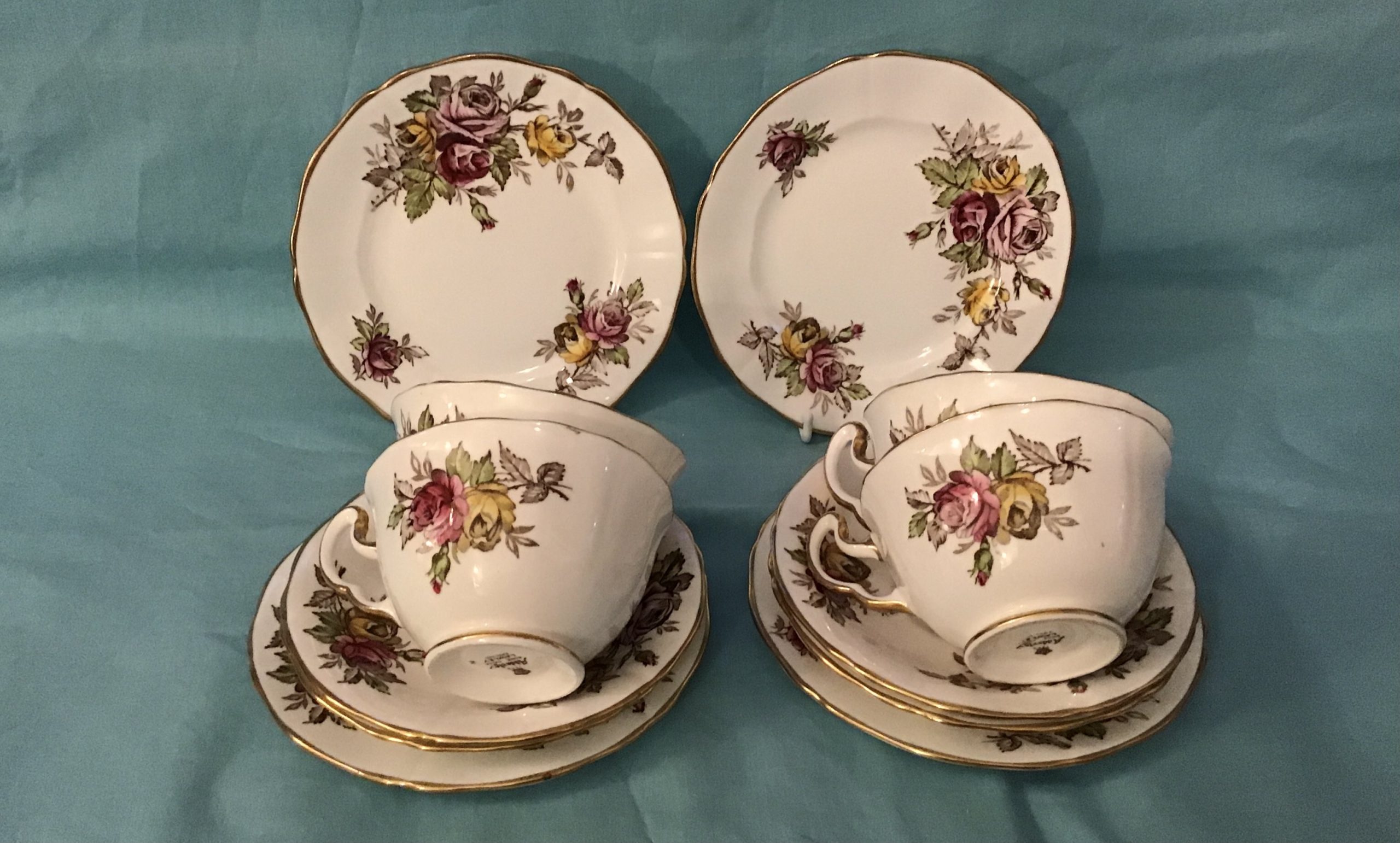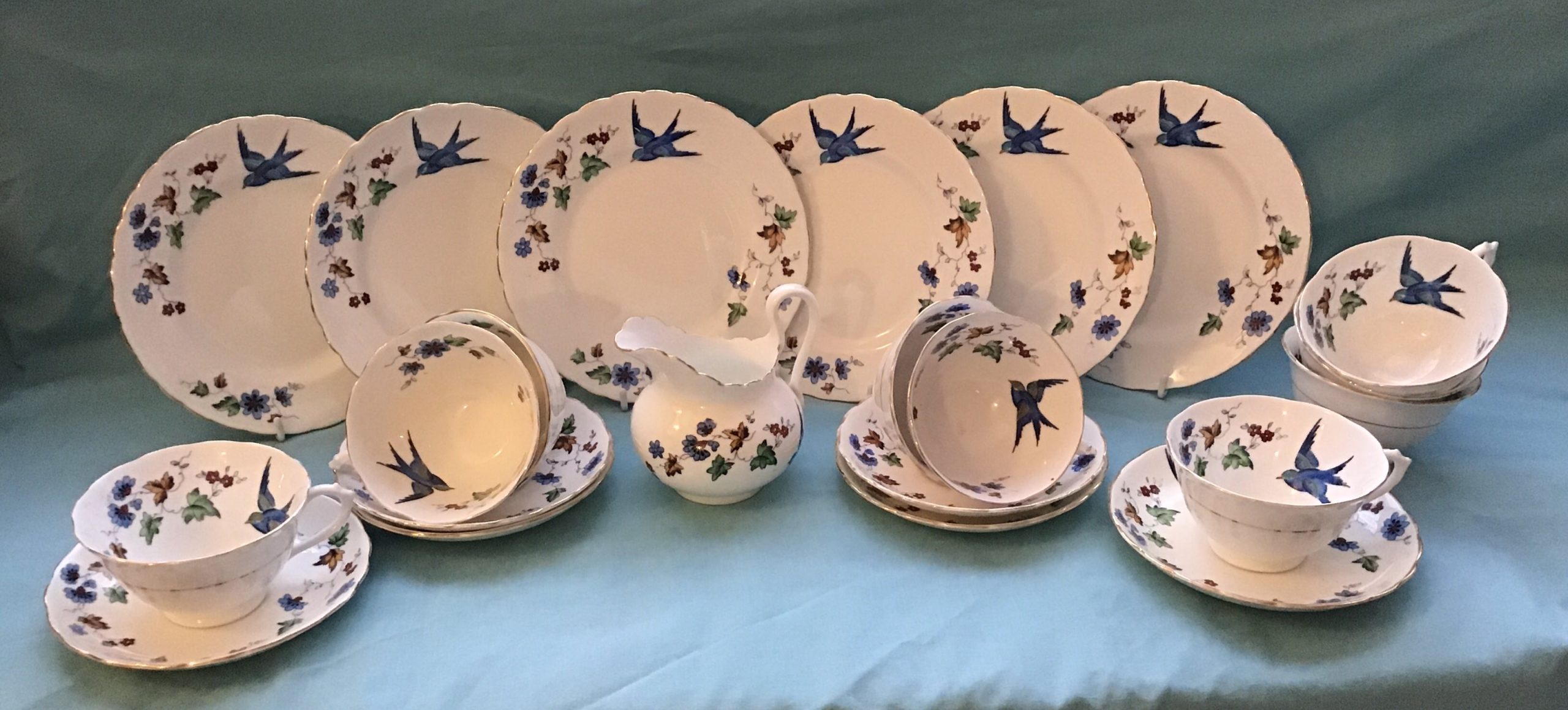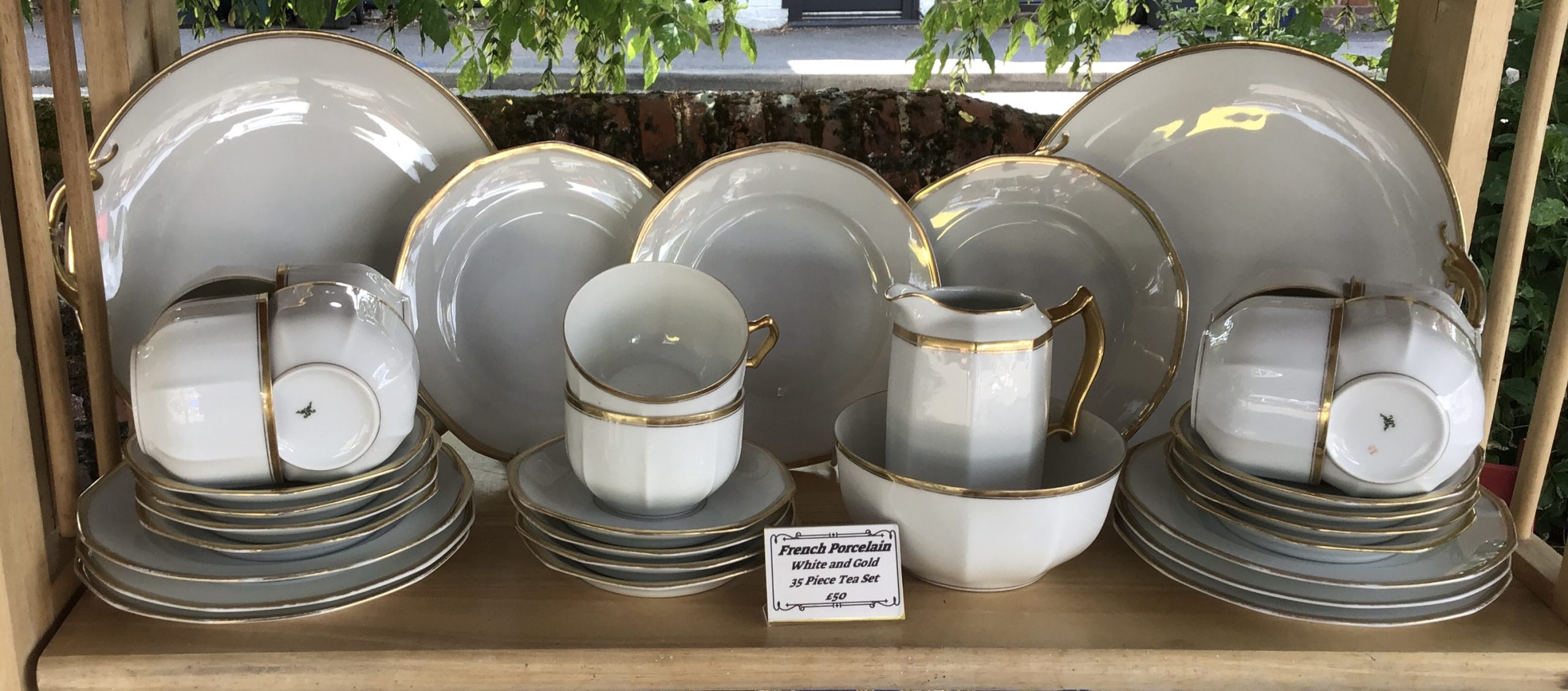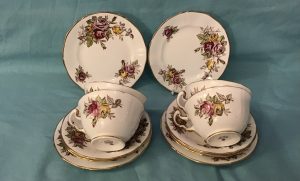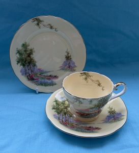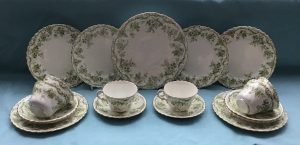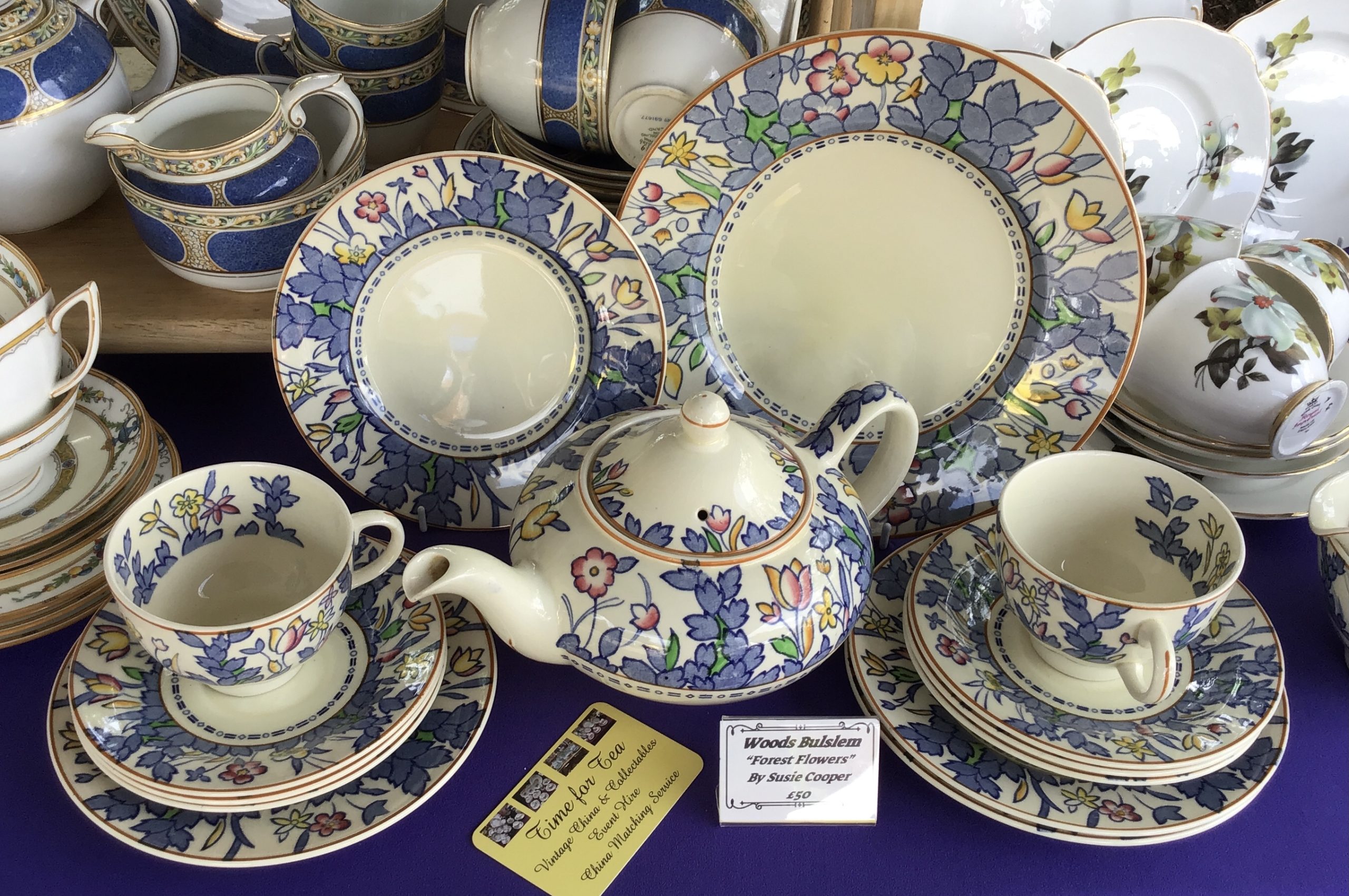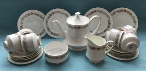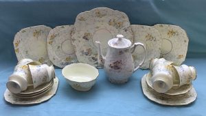 Paragon Country LaneRoyal Albert Val D’orParagon BelindaColclough Royale (Full Set, cake stand available)Colclough Royale Cake StandRoyal Standard, Fancy FreeParagon RockeryRoyal Standard, FascinationRoyal Albert, BraemarSalisbury China Imari StyleParagon, BelindaTuscan, Bluebird (extra 3 cups)Aynsley, Pagoda Set with two extra Cup & SaucerShelley, Harebell (cup missing)Gossamer, Harlequin 6 Trio’sFrench Porcelain White and GoldRoyal Doulton CamelotTuscan China Green and WhiteA selection of Vintage China c1880Jackson & Gosling Old EnglishDenby SandstoneShelley, Wildflowers19c Staffordshire Chinese ChinaRoyal Doulton WindermereColclough Ivy LeafCanonsbury Wild CloverAynsley, Bluebell Three Trio’sRoyal Cauldron Trio’sAdderley, Manor Roses Set of FourWild Bros Evelyn 5 Trio’sParagon, Queen Anne 8 Soup Bowls & SaucersBlue Cornflower Sandwich SetStaffordshire, Imari Style Sandwich SetWoods Bulslem Forrest Flowers by Susie CooperMelba Ware, Floral Set 6 Trio’sRoyal Grafton Yellow Rose Two Trio’sDenby MemoriesQueen Anne Old County SprayRoyal Winton, Petunia Part Tea SetAlboth & Kaiser Alka KunstRoyal Crown Derby, Bali 6 Tea PlatesLimoges Set of 4 PlatesPair of Limoges PlatesParagon, Iceland Poppy Pair of Cake PlatesWedgwood Cake PlatesMyott, Coronation Rose Pair of Cake PlatesRoyal Doulton, Art Deco Fruit SetRoyal Grafton Majestic Cake StandLeighton Pottery Burslem Cake StandMinton & Holins Japanese ImariAynsley, Green & Gold Cake Plate1989 Christmas PlateAynsley, Bluebell Cake PlateArt Deco Pressed Glass PlateVictorian Large Meat PlaterF Winkle & Co Partridge Tea PotYugoslavian China made for AvonRoyal Doulton Tea Pot (a/f)Tom Tit Teapot StandWinterling, Bavaria TrioSutherland, Art Deco TrioCarlton China, Springtime Swallows, TrioAynsley, Bluebell TrioParagon, Primrose TrioParagon, Woodland Bluebell TrioWedgwood, Colchester Cup and SaucerHadfords, Blue Poppy Cup and SaucerCrown Staffordshire, Forsythia Cup and SaucerBurleigh Ware, Zenith Cup & SaucerColclough, Lyndon Cup & SaucerHeathcote China The PathwaysRoyal Albert GossamerRoyal Albert Flower of the MonthRoyal Cauldron Milk & Sugar BowlDuchess China Sugar Bowl & Milk JugAynsley, Bluebell Sugar BowlPrice Kensington Mr Celery PotCarlton Ware, Scotch Whisky Water JugCut Glass and Plated Silver Tantalus